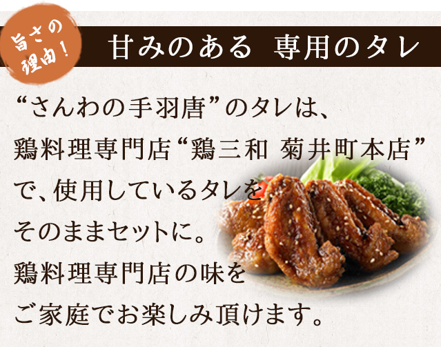 冷凍手羽先、たれ、スパイス、ごまが入った、鶏三和の味が再現できるセットです。