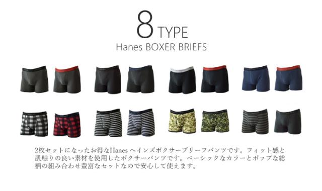 2枚セットになったお得なHanes_ヘインズボクサーブリーフパンツです。フィット感と肌触りの良い素材を使用したボクサーパンツです。ベーシックなカラーとポップな総柄の組み合わせ豊富なセットなので安心して使えます。前開きタイプ。