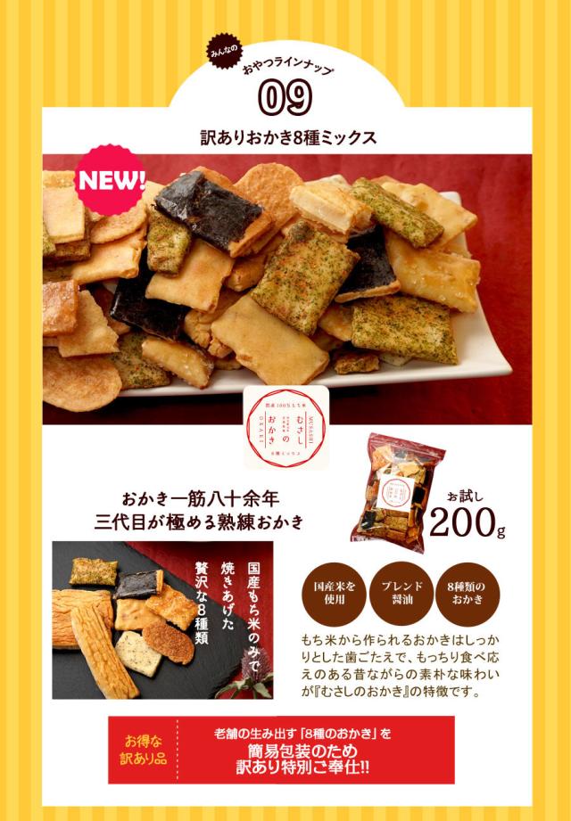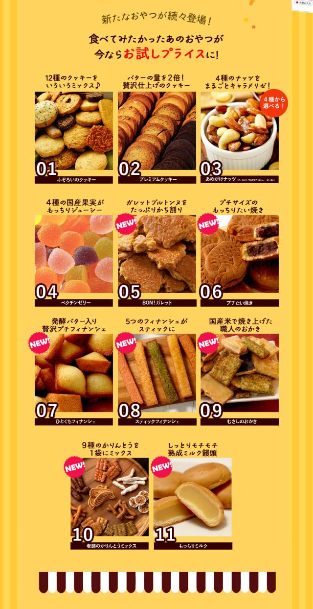 | 内容量 | 【フロランタン】5個入り 【ふぞろいクッキー】130g 【プレミアムクッキー】10枚入り 【あめがけアーモンド】150g 【あめがけマカダミア】100g 【あめがけピーカン】100g 【あめがけカシュー】150g 【Bon!ガレット】120g 【プチたい焼き】7個入り 【プチフィナンシェ】20個入り 【スティックケーキ】5本入り 【むさしのおかき】200g 【かりんとうミックス】200g 【ミルク饅頭】6個入り |