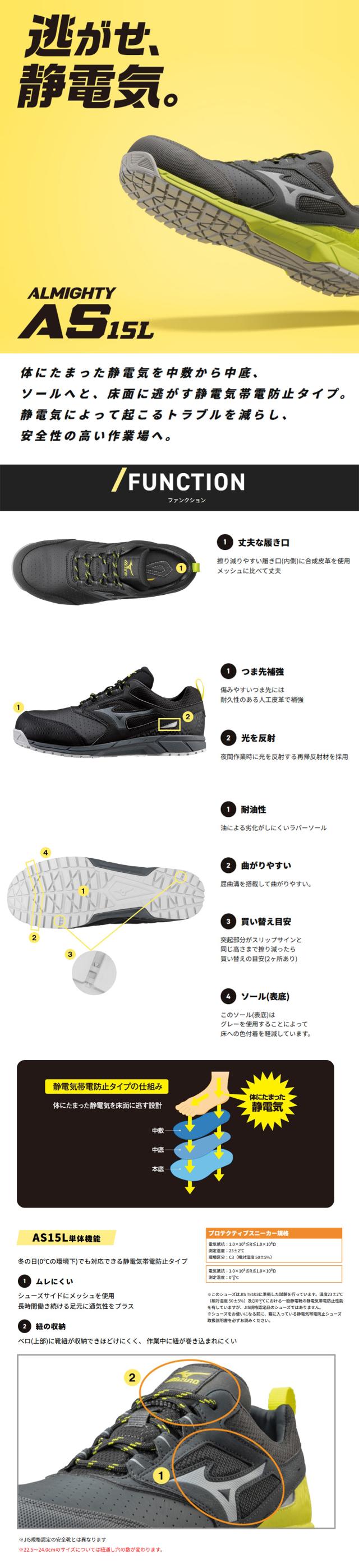 安全靴 ミズノ MIZUNO ALMIGHTY AS15L オールマイティ 紐靴 JSAA プロテクティブスニーカー 静電気帯電防止 帯電 制電 軽量 耐滑 かっこいい おしゃれ メンズ レディース ユニセックス 軽量 疲れにくい 樹脂先芯 クッション性