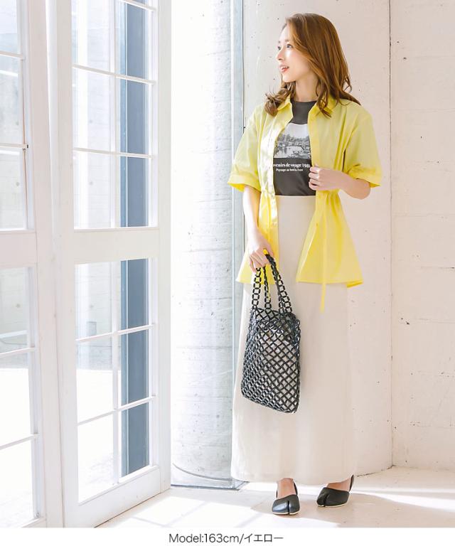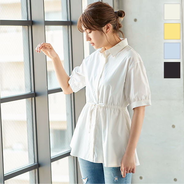 春新作 ウエストリボンブラウス C4627 入荷済 OR プレゼント レディース 体型カバー トップス シャツ ブラウス ウエストマーク 羽織 綿 コットン Tシャツ ゆったり 二の腕 お腹 お尻 カジュアル 無地