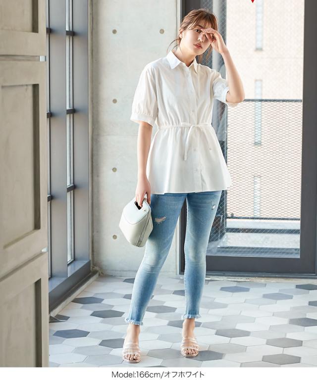 ウエストの切替のあるシルエットが女性らしいウエストリボンブラウス。腕の部分はふっくらと仕上げ、さりげなく二の腕をカバー。ベーシックな襟付きで、清潔感のあるキレイな首元に。【素材・サイズ感】きちんとハリ感のある綿100%のシャツ素材。ウエストから広がるフレアシルエットが気になる腰回りをカバー。シャツとしても、前を開けて羽織としても着こなせる1枚です。※キャンセル/変更不可※お届けまでの日程について