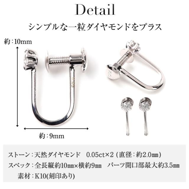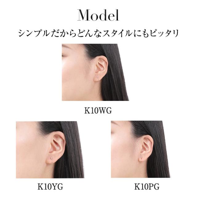 【素材・商品サイズ】ストーン:天然ダイヤモンド 両耳合計 0.1ct(直径約2mm) 素材: K10WG(ホワイトゴールド)/YG(イエローゴールド)/PG(ピンクゴールド)の3色からお選びいただけます。 全長縦約10mm×横約9mm パーツ開口部最大限3.5mm U字金具