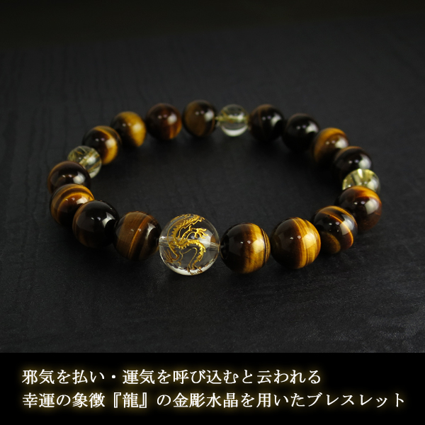 邪気を払い・運気を呼び込むと云われる、幸運の象徴『龍』の彫り水晶を用いたブレスレットです。