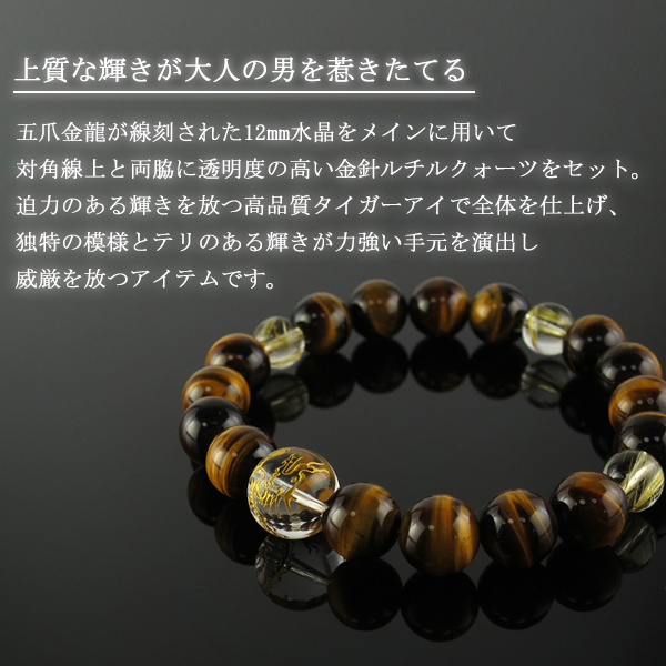 高品質 五爪金龍 線刻 手彫り水晶 天然石 ブレスレット 18.5cm パワーストーン 金針ルチルクォーツ タイガーアイ 虎目 天然石ブレス 数珠ブレスレット