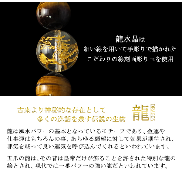 龍水晶は細かな線を用いて描かれた、高級感のある手彫り線刻絵の彫り玉を使用!