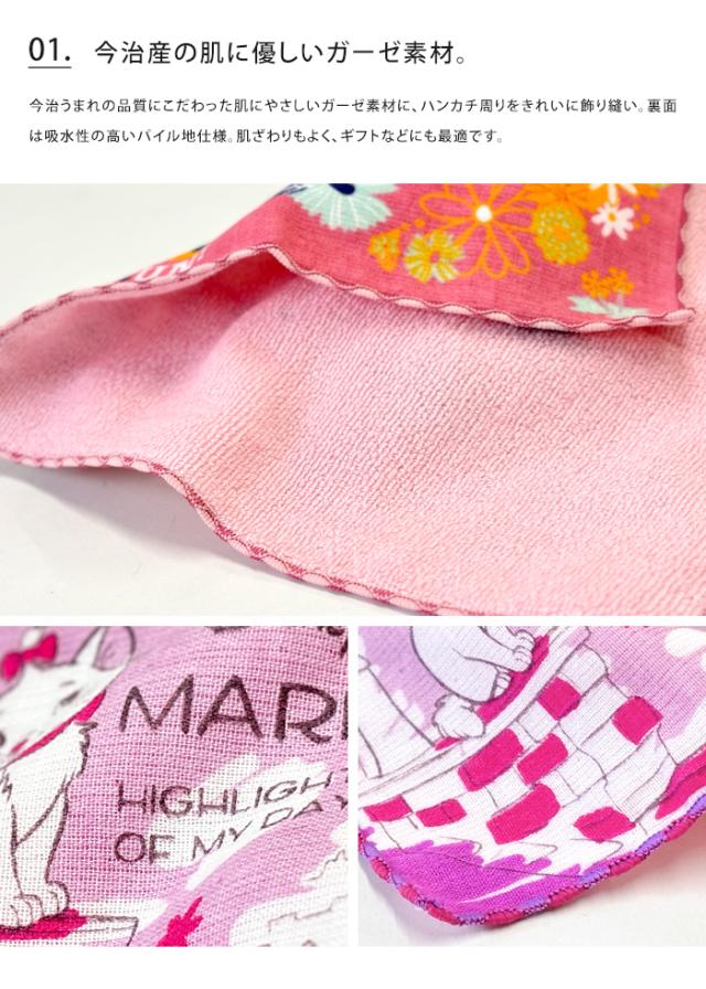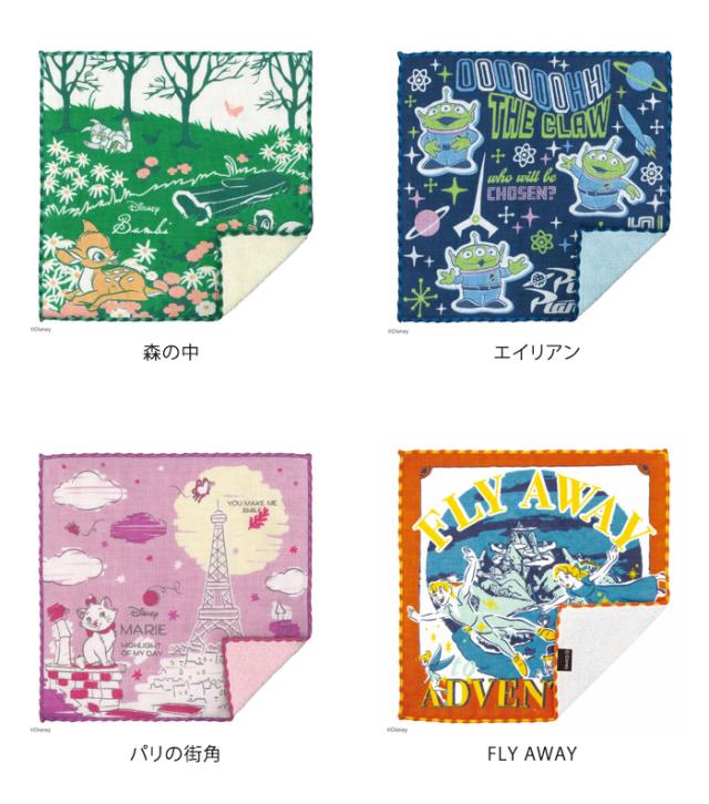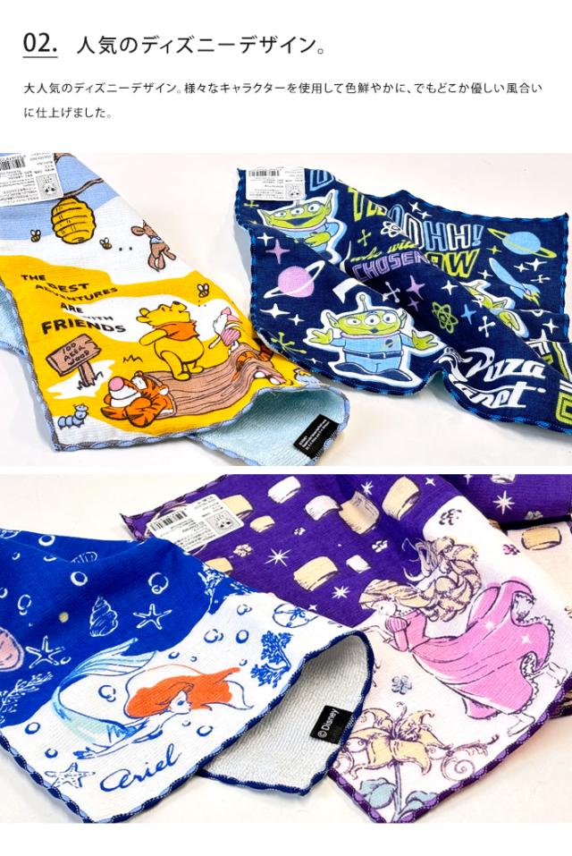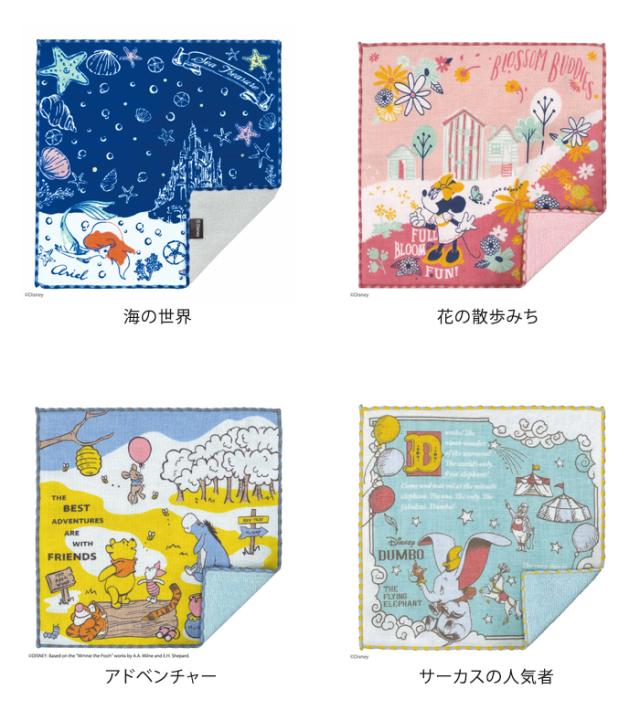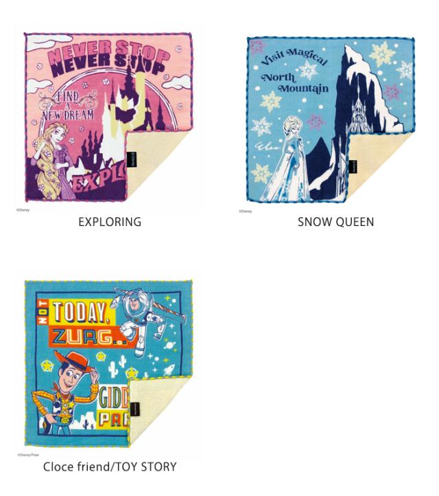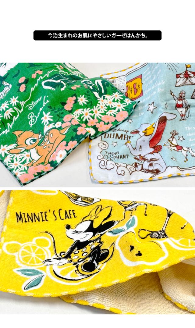 今治うまれの品質にこだわった肌にやさしいガーゼ素材に、ハンカチ周りをきれいに飾り縫い。裏面は吸水性の高いパイル地仕様。肌ざわりもよく、ギフトなどにも最適です。大人気のディズニーキャラクターのミッキー・ミニー・くまのプーさん・ラプンツェル・アリエル・アナと雪の女王・バンビ・ダンボなどを色鮮やかに、でもどこか優しい風合いに仕上げました。