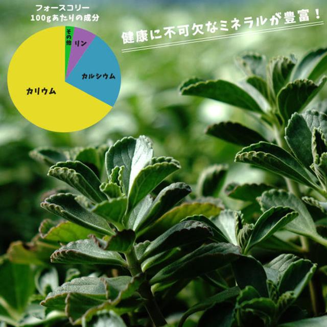 フォースコリーには、様々な栄養素が含まれていることは間違いありません。カリウム、マグネシウム、カルシウムなどのミネラルや食物繊維を豊富に含んでいます。特に、カリウムに関して言えば緑茶と比較して約2.5倍ほど含まれています。