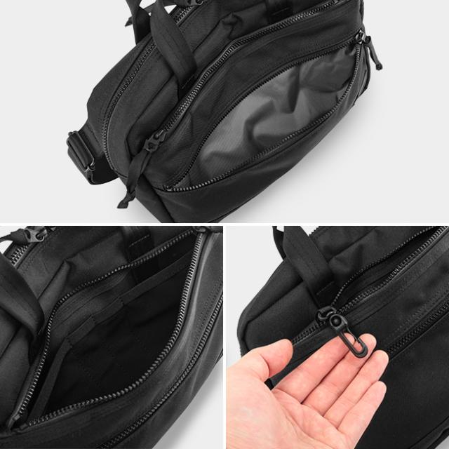 使い勝手が良い3つのファスナーポケット。一番大きなファスナーポケットの内装には伸縮性のあるパワーネット素材のポケットとペン差し、キーフック付き。