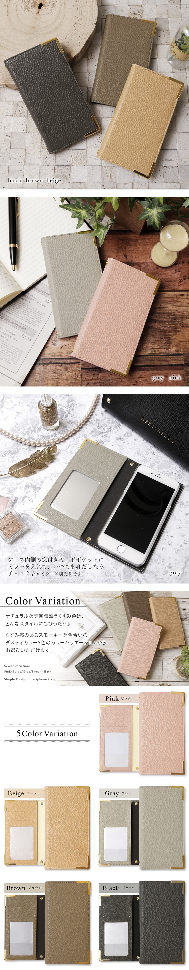 シンプルレザー調手帳型ケース全5色×大人のゴールドフレーム