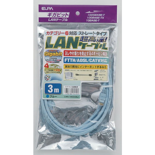 ELPA LANケーブル CAT6 3m ブルー カテゴリ6準拠 LAN-1030BL FTTH・ADSL・CATV対応 8極8芯用 エルパ メール便送料無料
