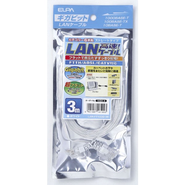 ELPA フラットLANケーブル CAT6 3m ホワイト カテゴリ6準拠 LAN-FT1030W 電話機 FAX FTTH・ADSL・CATV対応 エルパ メール便送料無料