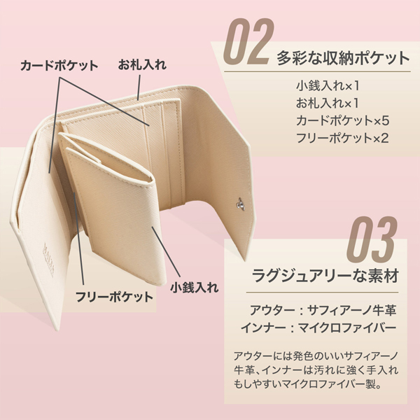 無駄のない三つ折り設計にボックス型の小銭入れの組み合わせ。
