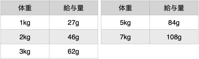 ・猫によって必要とする食事量は異なります。与え始めはこの表を参考にして、健康的な体型を維持できるよう、愛猫の生活環境や年齢、活動量などを踏まえ、給与量を調整してください。