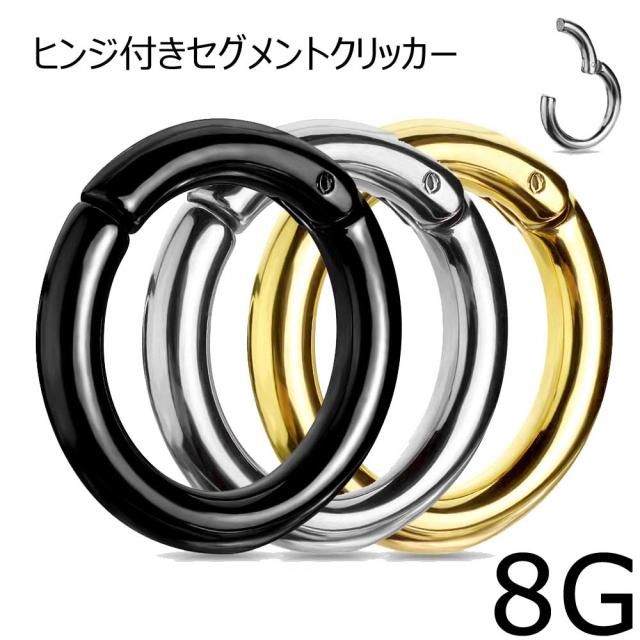 [ワンタッチ リング型 ボディピアス 8G ] ヒンジ付きセグメントクリッカー ボディーピアス 8ゲージ シルバー 銀色 ブラック 黒色 金色 ゴールド サージカルステンレス316L製 メンズ レディース シンプル 蝶番 鼻 セプタム 軟骨 ヘリックス 耳 ニップル 乳首 口 シームレス