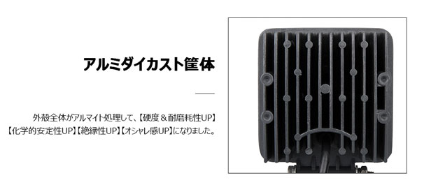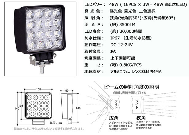 | LEDパワー: 48W 本 体 色: 黒色 照 射 角: 60度 明 る さ: (約) 4800LM 発 光 色: 6500K(ホワイト) LED 寿命: (約) 50000時間 防水仕様: IP67 (生活防水) 動作電圧: DC12-24V 取付金具: あり 角度調整: 上下調節可能 重 さ: (約) 0.8KG 本体素材: アルミニウム、レンズ材料PC |