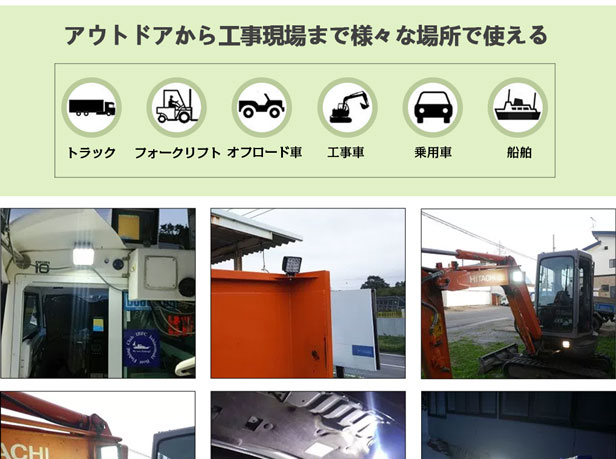 | ☞ キャンプ、アウトドア、夜間、乗用車やトラックでの積み卸し、工事現場、防犯グッズに最適です。 ☞ トラックの荷台用の照明、フォークリフトのライト、除雪車のライト、海苔漁の常夜灯、シラス漁の常夜灯、漁船の作業用ライト、トラクターのライト、夜釣りの照明・集魚ライト、漁業用、農業機械、建設機械等の作業に、災害時の備えに、交通整理に、工事現場に様々な場面で活躍できます! ☞ 屋外や現場作業にも便利です。 |