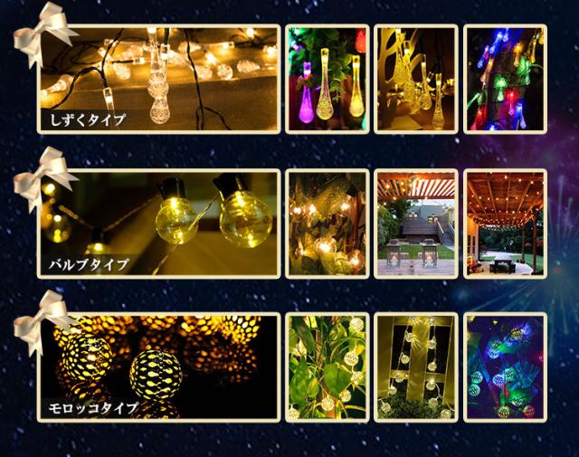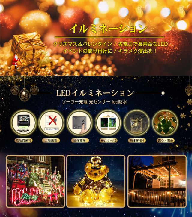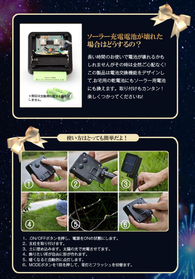 | 1 使用場合:クリスマスとか、ウエッデイングとか、色々な場所に最適な選択物です! 2 お庭の植え込みに、ラティスやベランダに!クリスマスイルミネーションにピッタリです! 3 ソーラーパネルで充電するので、電源不要で電気代0円!経済的でエコなイルミネーションです! 4 宝石のような美しいLEDジュエリーライトです。きらきら飾りLEDジュエリーライト子供にも、大人にも大人気です。 5 夜になると、ロマンチックな雰囲気を作り出される。 フレキシブルなワイヤーで、独特な形を作ることもできます! 6 結婚式の背景、ホテル、レストラン、商業ビル、家庭、窓、クラブ、コンサート、カラオケ、ファッションショー、ダンスホール、クリスマスなどに最適しております。 7 電源配線が要らないのでLEDを飾り付け、ソーラーパネルをお日様が良く当たるところへ設置していただくだけで簡単にご使用いただけます。エクステリアにも活躍です。 8 電源をonにしておけば暗くなると自動で点灯、明るくなると自動で消灯する明るさセンサー付きなのでとても便利!使用しない場合は電源をOFFにしておけば消灯する。畜電されません。 |
