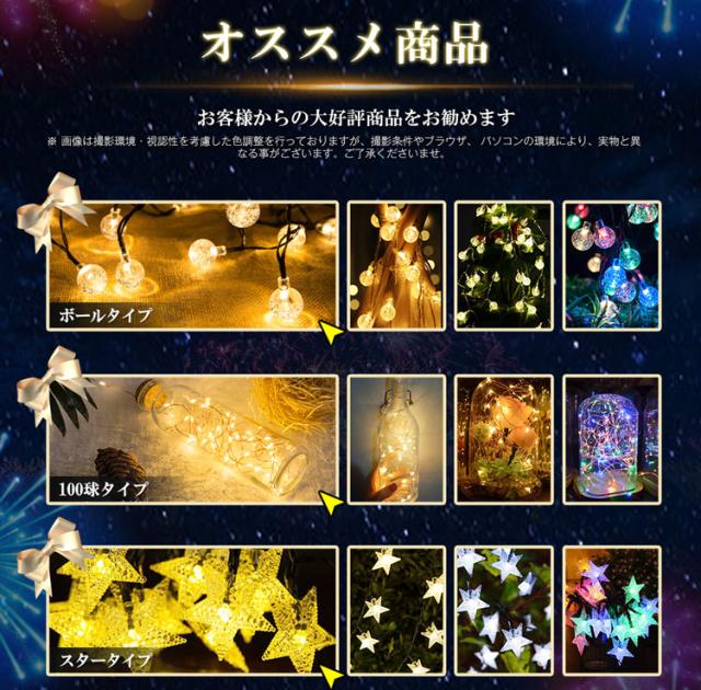 | 商 品 名: 照度センサー LED イルミネーション LED球数: 30球 (高輝度拡散LED) LED間隔: 約14-16cm 全 長 さ: 全長約 400-700cm ・ ピラー約 19cm パターン: 2種類点灯パターン内蔵 常時点灯と点滅 (MODEボタン押しでパターン切り替え) 発 光 色: ミックス、シャンパンゴールド、ホワイト 商品重量: 約200-300g 商品材質: プラスチック(パネル部分は含みません) 防水等級: IP44(防雨型プラグ採用) 内臓電池: 1.2V 600mAh AAニッケル水素電池 点灯時間: 日中8時間の充電で約6?7時間点灯。 充電方法: ★ソーラーパネルにて充電させます。 (電源をONの状態で太陽の光で充電され、OFFでは蓄電されません) ★充電時間、点灯時間は設置場所や天候、季節によって異なります。 |