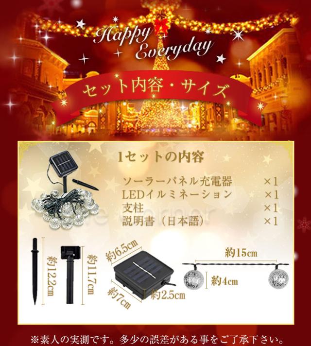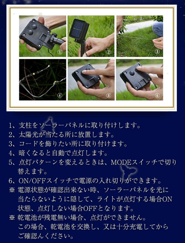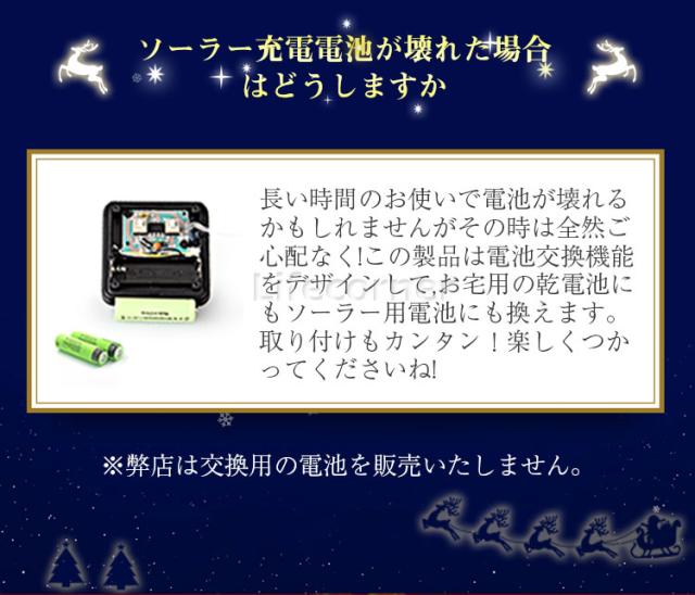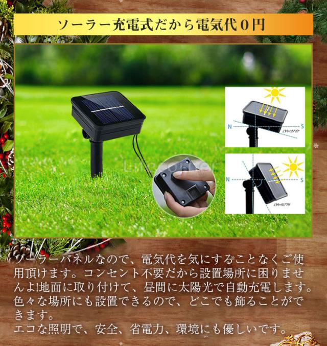 | ☞ 安心の3ヶ月保証付き! ※ 北海道・沖縄・離島への発送には別途追加送料が必要です。ご注文時には追加送料は加算されておりません。 ※ 水没する可能性のある場所では、使用しないでください。 ※ 電球部分防水、(屋外に設置すると金属部分が錆びる可能性がある) ※ 点灯時間は設置場所、天候、日照時間等によって変動します。 ※ 夜間、周囲が明るくなる場所に設置すると、照度センサーが感知せず点灯しない場合があります。 ※ イルミネーション施工時に衝撃等で、部分的に少数のLEDが点灯しなくなる場合がございます。 ※ ソーラーパネルの泥汚れ、水垢などは発電を低下させるので、こまめにキズが付かないよう拭きとって下さい。 |