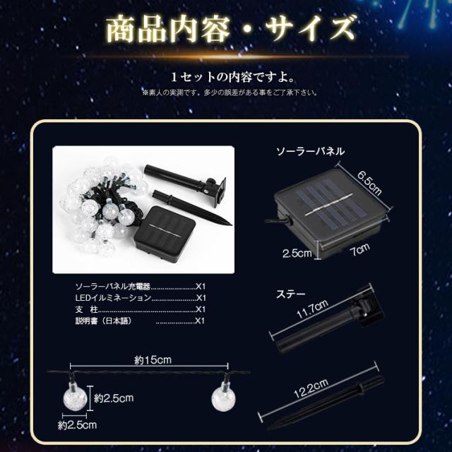 | 1 使用場合:クリスマスとか、ウエッデイングとか、色々な場所に最適な選択物です! 2 お庭の植え込みに、ラティスやベランダに!クリスマスイルミネーションにピッタリです! 3 ソーラーパネルで充電するので、電源不要で電気代0円!経済的でエコなイルミネーションです! 4 宝石のような美しいLEDジュエリーライトです。きらきら飾りLEDジュエリーライト子供にも、大人にも大人気です。 5 夜になると、ロマンチックな雰囲気を作り出される。 フレキシブルなワイヤーで、独特な形を作ることもできます! 6 結婚式の背景、ホテル、レストラン、商業ビル、家庭、窓、クラブ、コンサート、カラオケ、ファッションショー、ダンスホール、クリスマスなどに最適しております。 7 電源配線が要らないのでLEDを飾り付け、ソーラーパネルをお日様が良く当たるところへ設置していただくだけで簡単にご使用いただけます。エクステリアにも活躍です。 8 電源をonにしておけば暗くなると自動で点灯、明るくなると自動で消灯する明るさセンサー付きなのでとても便利!使用しない場合は電源をOFFにしておけば消灯する。畜電されません。 |