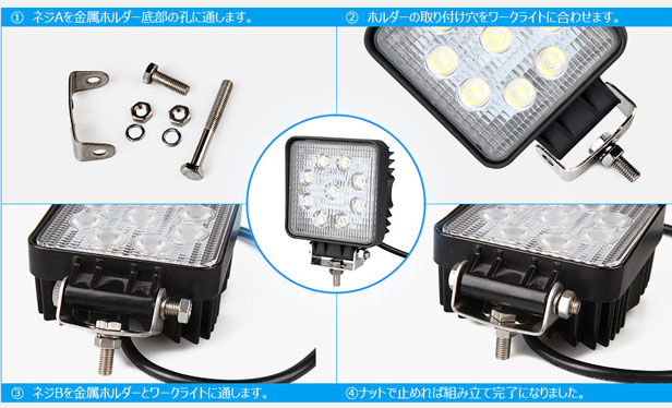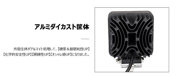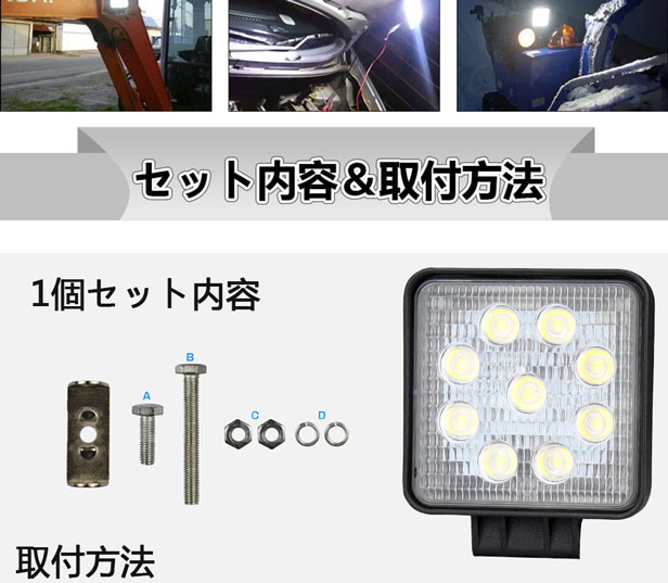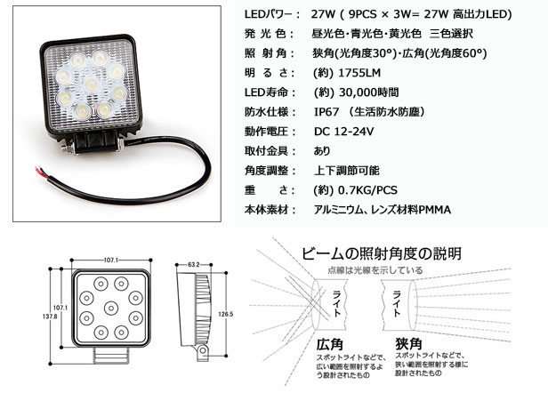 | LEDパワー: 27W 本 体 色: 黒色 照 射 角: 60度 明 る さ: (約) 1755LM 発 光 色: 昼光色(6000K-6500K) LED 寿命: (約) 50000時間 防水仕様: IP67 (生活防水) 動作電圧: DC12-24V 取付金具: あり 角度調整: 上下調節可能 重 さ: (約) 0.7KG 本体素材: アルミニウム、レンズ材料PMMA |