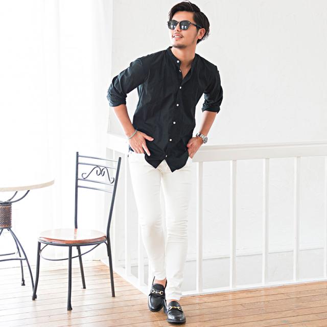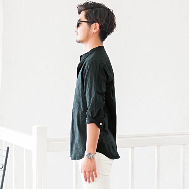 襟元は帯のようなバンドカラーを採用し、トップスやインナーとして様々な着こなしが楽しめます。