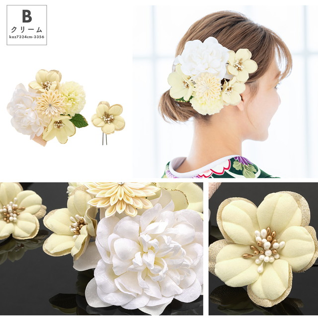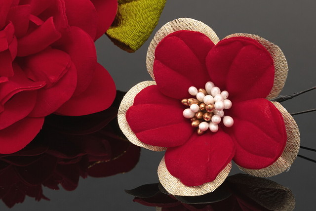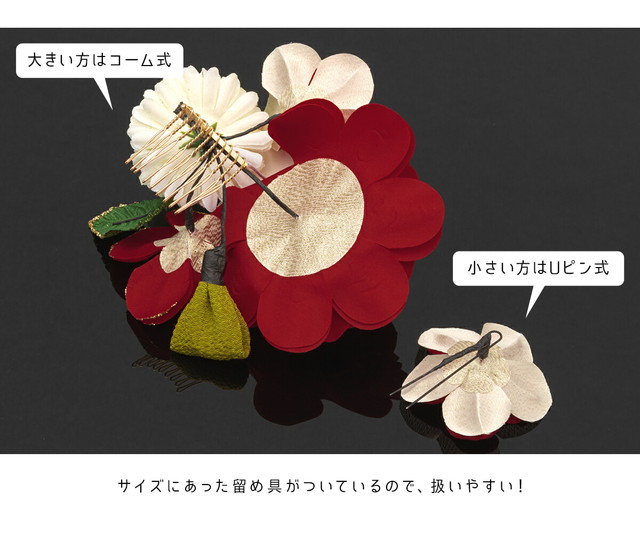 大きな髪飾りの留め具はコーム式、小さな髪飾りはUピン式です。