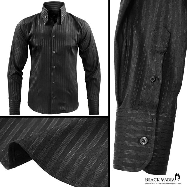 サテンシャツ スワロフスキー釦 ドレスシャツ スキッパー ストライプ ジャガード ボタンダウン スリム 日本製(ブラック黒) 191852