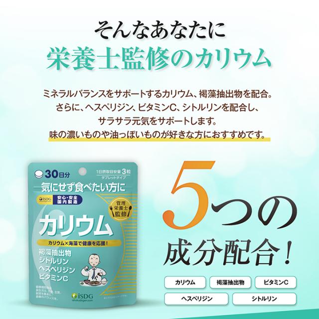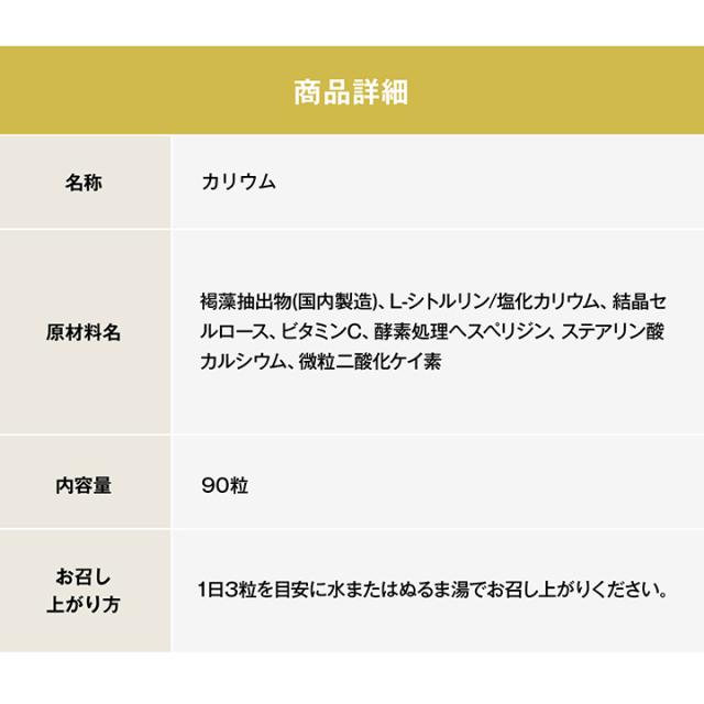 - 血圧が気になりだしたので、カリウムのサプリを探していたのですが、ドラッグストアに何十種類とサプリがあっても、カリウムのサプリは置いていなくてこちらでやっと見つけました。3ヶ月試してみます。