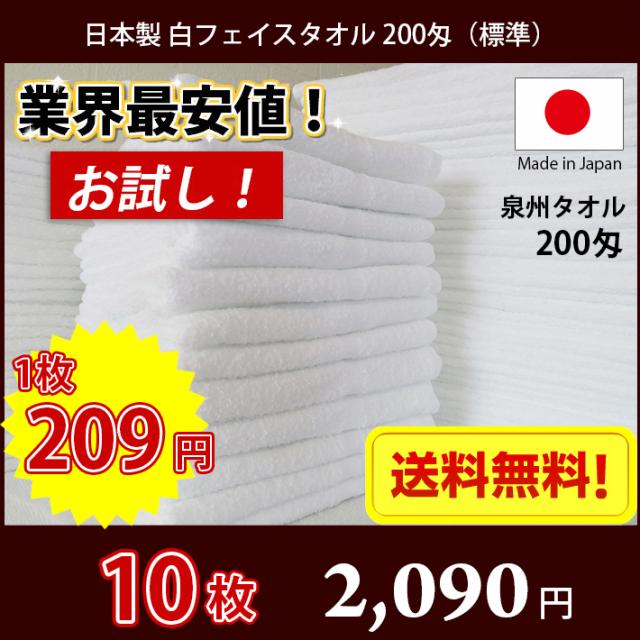 【送料無料】業界最安値! 10枚セット 日本製 泉州 白タオル 200匁 / 標準のタオル 普通のタオル 白いタオル 業務用タオル タオル フェイス 白 ホワイト 業務用 掃除 雑巾 まとめ買い 国産