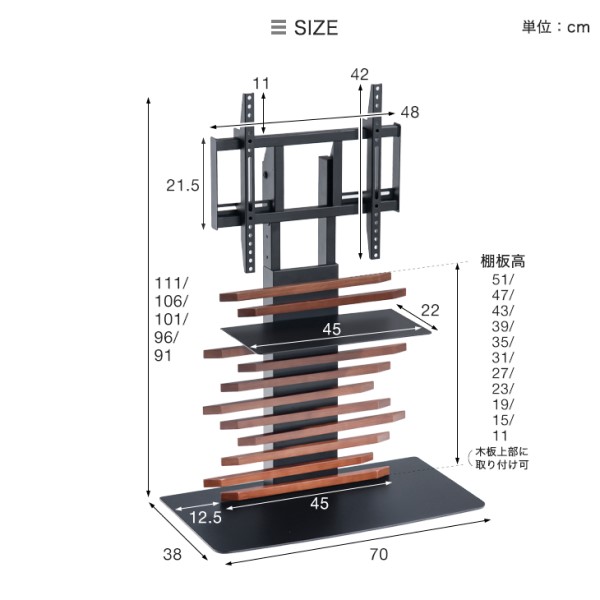 ※テレビ取付穴の位置がディスプレイの上部から10cm以内にある場合は、木板の隠れる範囲が増える可能性があります。予めご注意下さい。