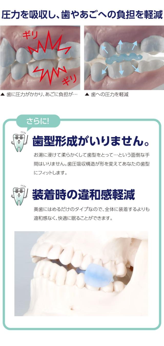食いしばりは、歯を激しく摩耗し、ひどい知覚過敏や歯周病を引き起こします。肩こりや頭痛、そしてなぜか腰痛やひざ痛まで引き起こし、全身の筋肉と神経を疲労させます。また、歯ぎしり音はが周りに迷惑をかけるので後ろめたい気持ちになりがちです。当商品は、寝る時にはめるだけで歯ぎしりや食いしばりを簡単に防ぐことができます。噛み合わせ矯正ではないので、失敗が多い面倒な型どりが必要ありません。寝る時にはめるだけで歯圧が吸収分散し、奥歯に負担をかけることなくピタっと止まります。