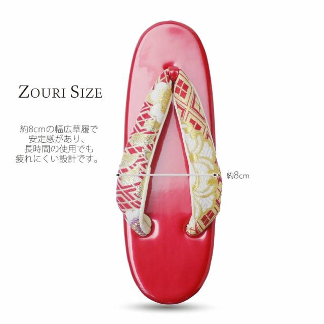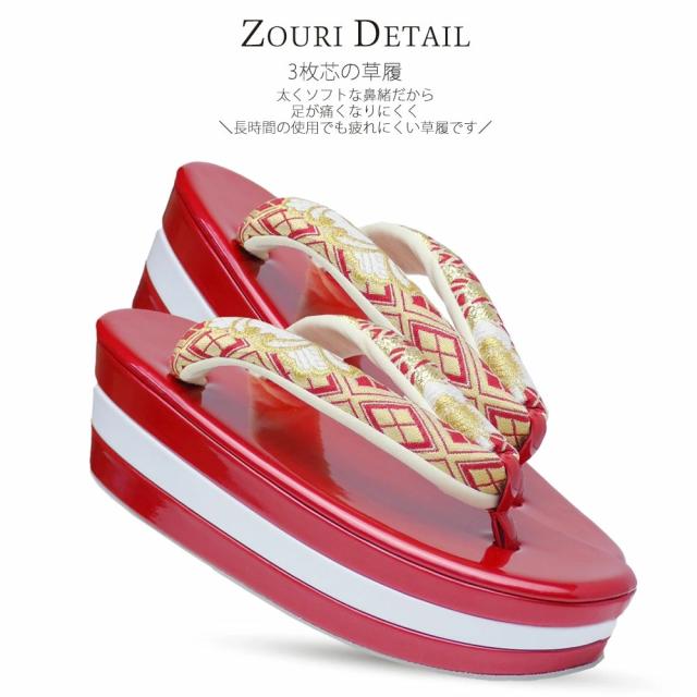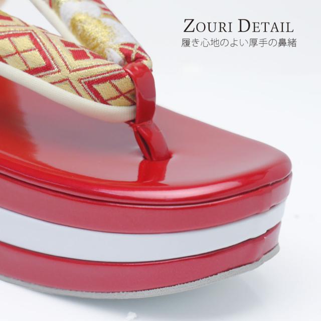 ヒールが高いので立ち姿が美しくなります。本物の帯地を使用した豪華な柄が特徴です。