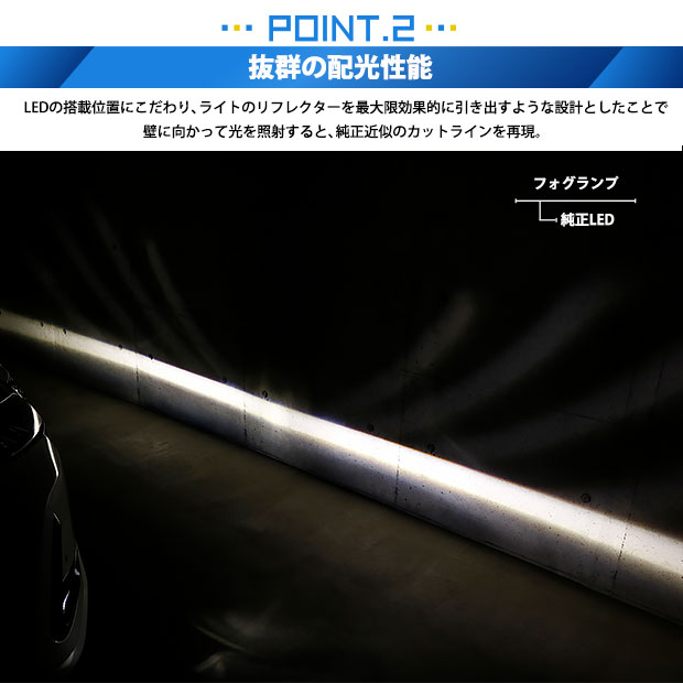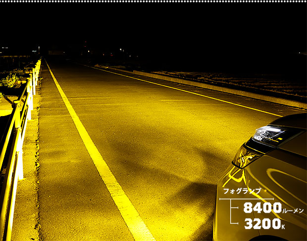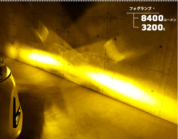55W ハロゲンランプの明るさ2200lm(※1)を超える十分な光量です。 全光束8400ルーメン(※2)、最強のモンスター級フォグランプ用LEDバルブキットです。