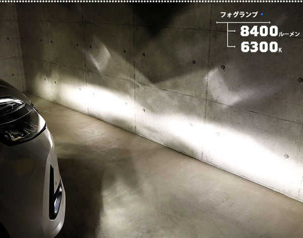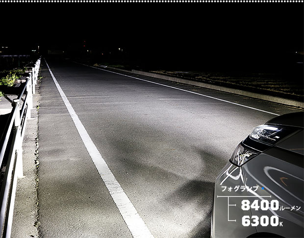 55W ハロゲンランプの明るさ2200lm(※1)を超える十分な光量です。 全光束8400ルーメン(※2)、最強のモンスター級フォグランプ用LEDバルブキットです。