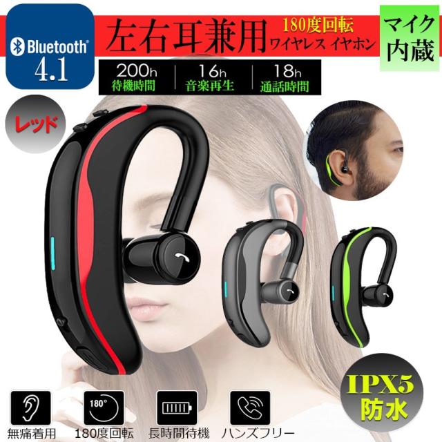 左右耳兼用 フォン レッド ワイヤレスイヤホン Bluetooth イヤホン 耳掛け型 ヘッドセット ハンズフリー 高音質 マイク内蔵 KATAMIMI-RD