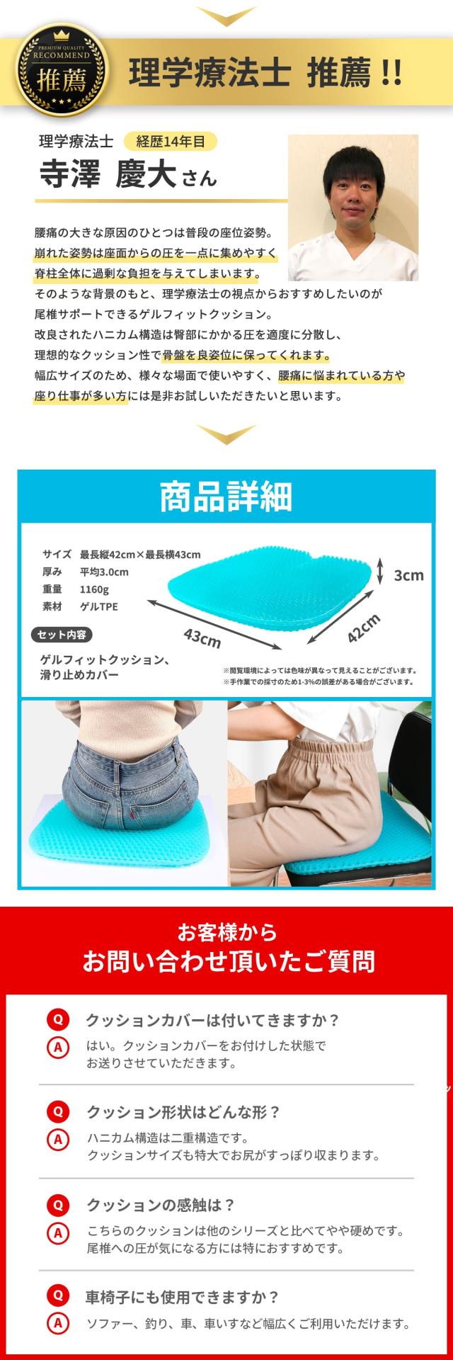 - 前に使っていたジェルクッションのクッションが悪くなったので買い直しました。 とても座りやすく長時間でもお尻が痛くならないので良かったです、