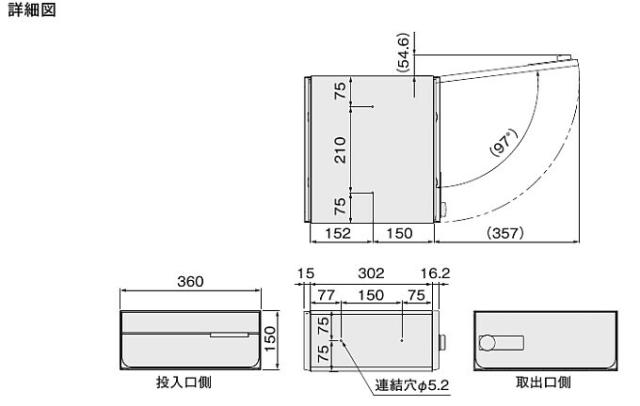 注)郵便物取り出しの際、郵便物のサイズによって扉を製品設定の全開角度にしないと取り出せない場合があります。設置の際は扉全開時のスペースをご配慮ください。