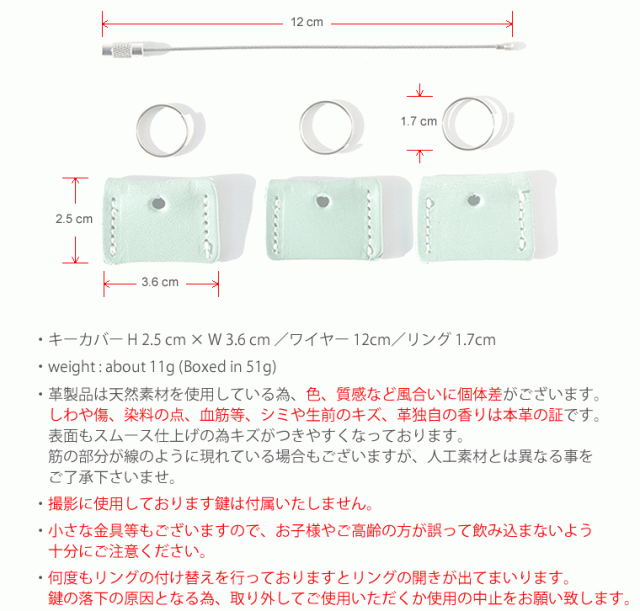 実寸:キーカバー H 2.5 cm × W 3.6 cm /ワイヤー 12cm/リング 1.7cm