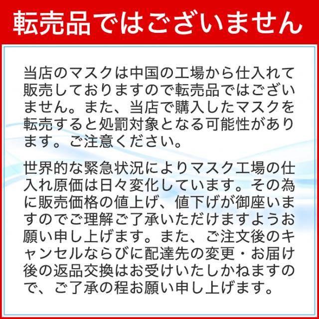 当店のマスクは中国の工場から仕入れて販売しておりますので転売品ではございません。また、当店で購入したマスクを転売すると処罰対象となる可能性があります。ご注意下さい。