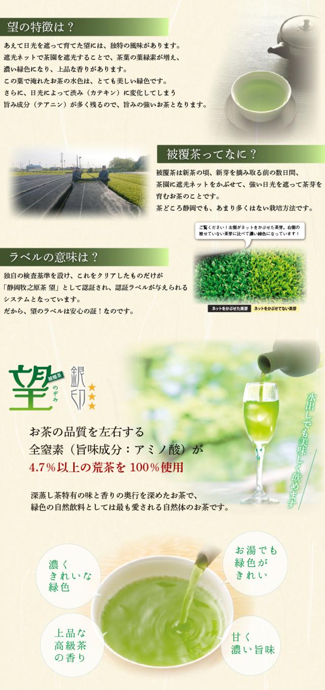 旨み成分の「テアニン」が多いので渋味が少なくまろやかで旨みの強いお茶です。被覆して栽培したお茶独特の、上品な香りがあります。