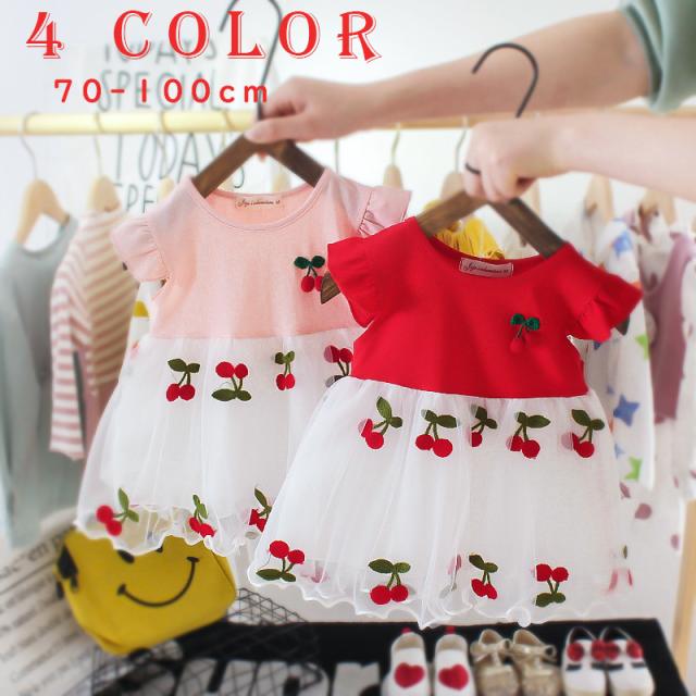 ベビー服 ベビーウェア ワンピース 半袖 さくらんぼ チェリー 刺繍 チュールスカート かわいい お出かけ 夏 女の子 赤 ピン