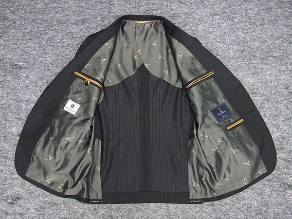 織ネーム(耳ネーム)を左胸内ポケットに、専用のロゴ入りジャガードを裏地に使用しています。