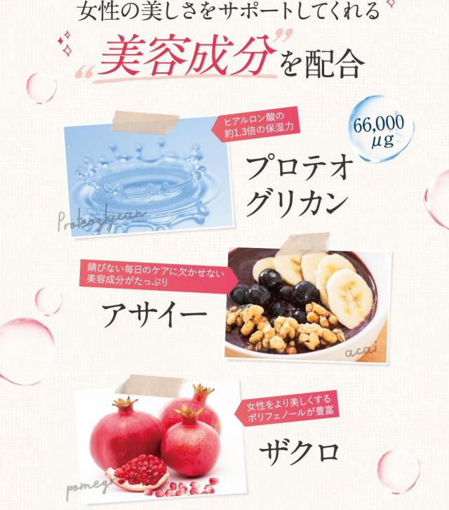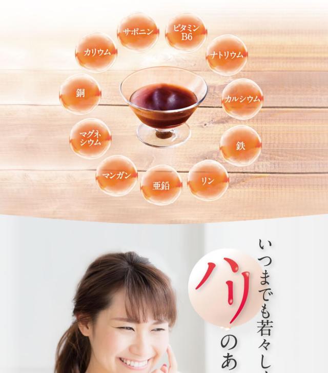 オリゴ糖、ライチ果汁、田七人参酢、ザクロ果汁、アサイーエキス、鮫軟骨抽出物、レモン果汁、寒天、羅漢果エキス、杜仲茶エキス、甘未(甘草)
