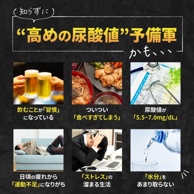 - プリン体を多く含む食べ物が好きで、健康診断で毎年尿酸値が上がってしまっています。 飲むだけたので簡単で今後の効果に期待します!