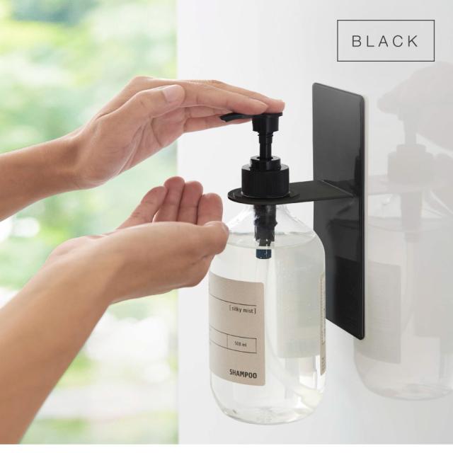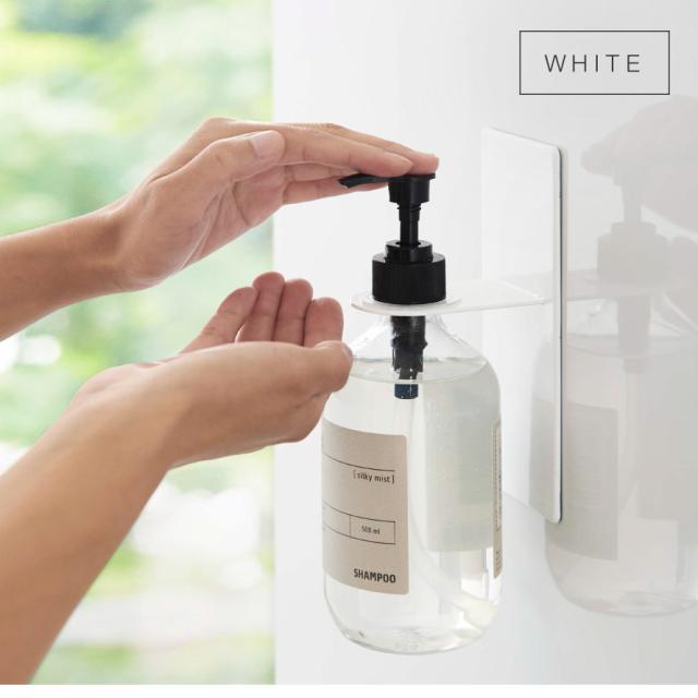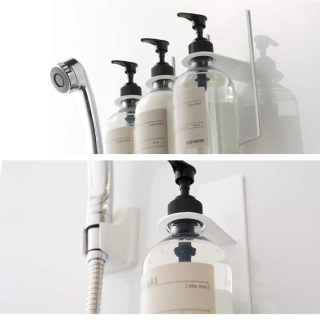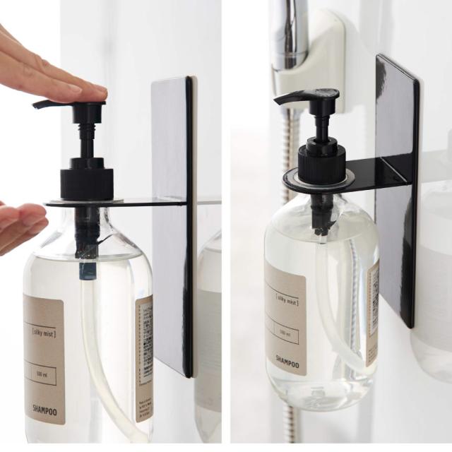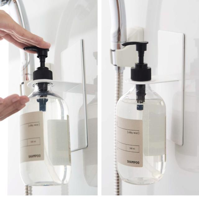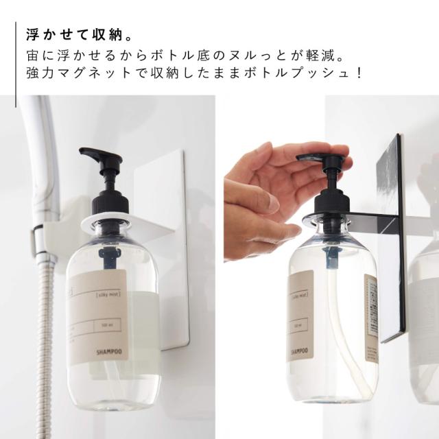 マグネットでバスルームの壁面に簡単取り付けできるディスペンサーホルダー。宙に浮かせるからボトルの底がイヤなヌルっとが軽減。強力マグネットで収納したままボトルプッシュして使えるのが便利!