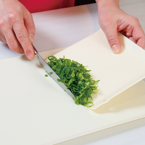1枚のまな板をお皿代わりとして切った食材を置いたまま、直接お鍋にいれやすいサイズです。