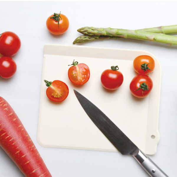 細かく切った食材のこぼれ落ちを防ぐフードストッパーがあるので移動する際にまな板を持ち上げやすく、通常の平らなシートまな板よりも取扱いしやすい形状です。