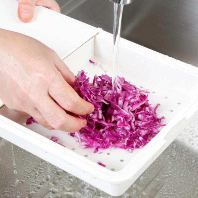 切った食材をスライドさせてザル面に落とし、食材を蛇口でそのまま水にさらすことができます。